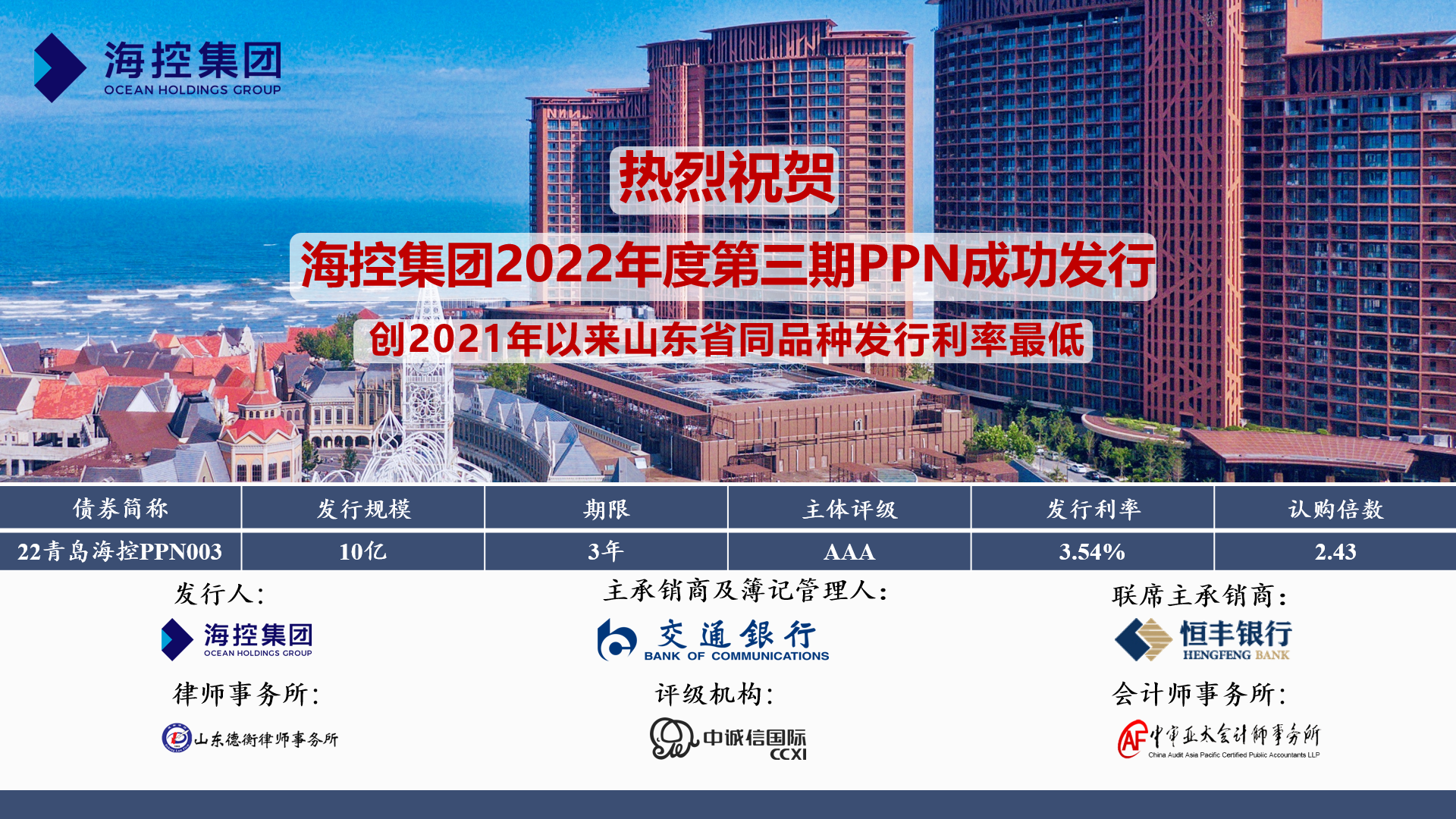 4月13日,海控集團“2022年第三期定向債務融資工具(PPN)”成功發行,期限3年,發行金額10億元,認購倍數2.43,發行票面年化利率3.54%,創2021年以來山東地區同品種最低利率。