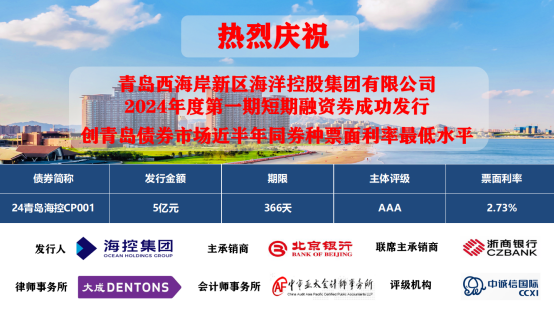 1月19日,海控集團成功發行2024年度第一期短期融資券(24青島海控CP001),募集資金5億元,期限1年,發行利率為2.73%,認購倍數5.72倍,創青島債券市場近半年同券種票面利率最低水平。