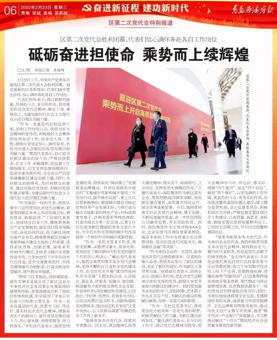 2月22日上午,中國共產(chǎn)黨青島市黃島區(qū)第二次代表大會(huì)勝利閉幕。肩負(fù)著新的任務(wù)和使命,代表們闊步走出會(huì)場,信心滿懷奔赴各自工作崗位。