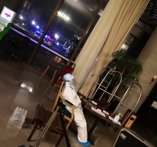 酒店內,客人對工作人員有一個親切的稱呼——“大白”,套上密不透氣的隔離防護服,從頭到腳“全副武裝”,從開始花費20分鐘,到現在熟能生巧5分鐘完成,脫防護服更是要細致認真,每脫一件都需要洗一次手,脫一趟下來,起碼要洗6、7次手。