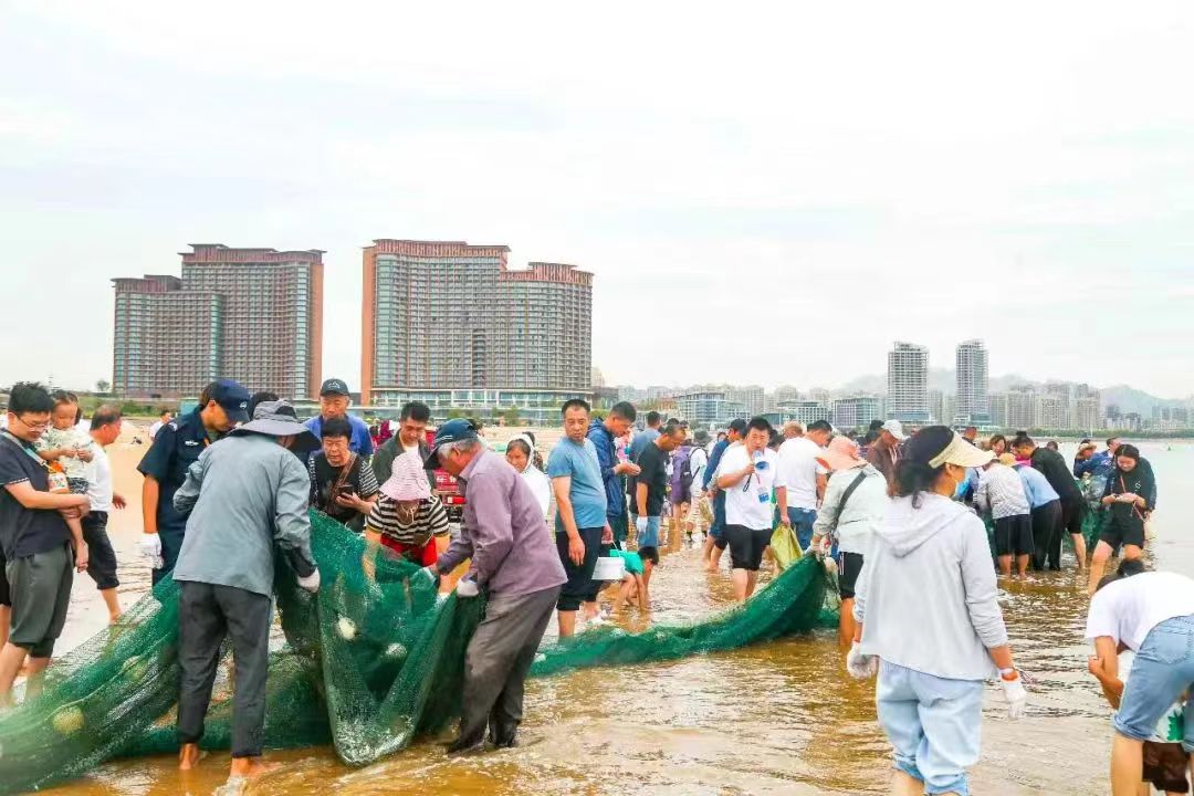 活動現場,碧海藍天如畫,漁家號子震天,百人同拉一張大網,同收一網魚獲,一起接受大海的饋贈。撒網、起錨、拉網、分魚,諸多游客和市民在漁把頭的帶領下沉浸式體驗拉網活動,感受原滋原味的膠東漁家文化。當天第一網拉上魚蝦蟹等豐富海鮮,漁把頭按照延續千年的傳統分配方式與大家分享拉網漁獲。“太有意思了,還想再拉一網!”來自河北的李女士一家拎著分到的一網兜魚,喜笑顏開。“沒想到時隔十年,還能有機會拉網捕魚!”來自一對生活在青島本地的老夫妻感慨道。